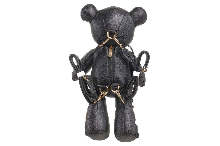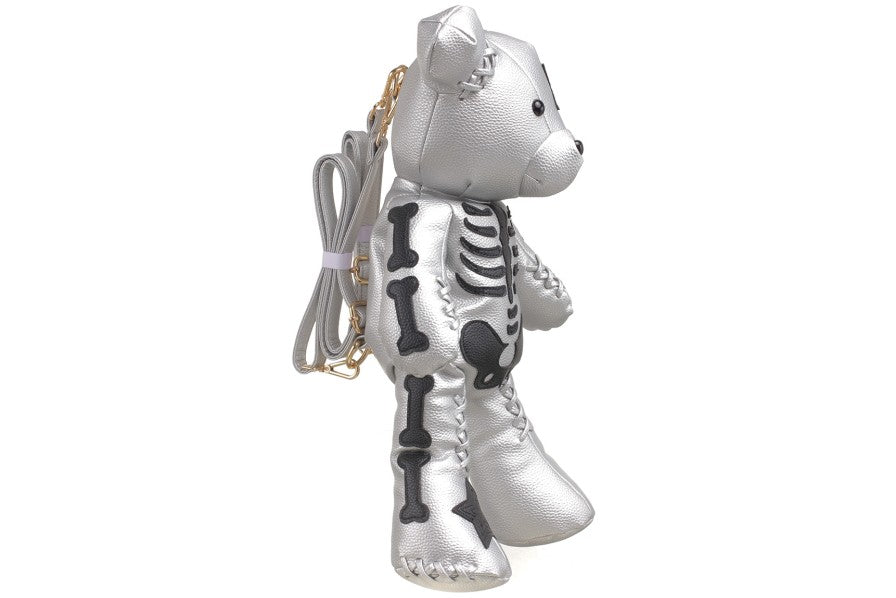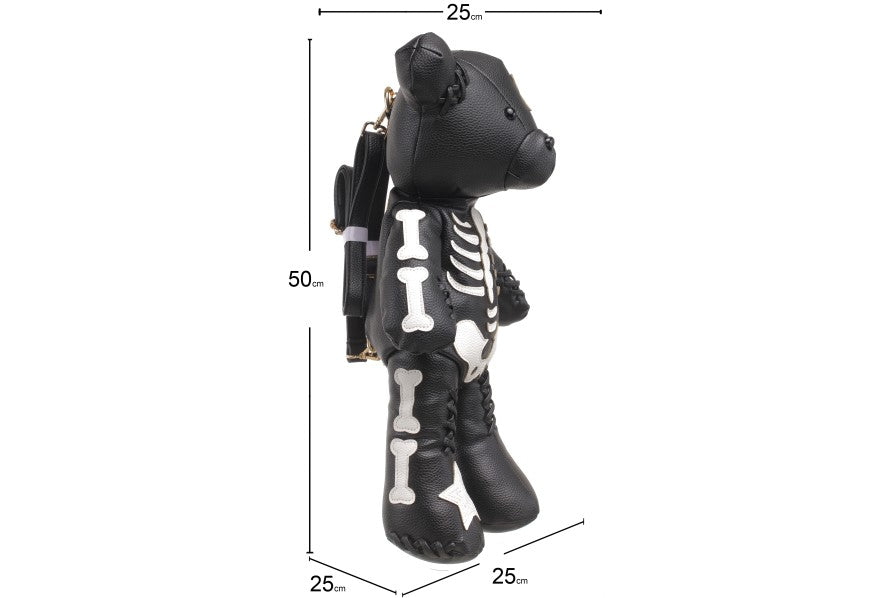 This sophisticated backpack showcases a teddy bear design with a skeleton motif and features a fully lined interior for added durability. It includes an adjustable strap and a secure zip closure for convenience. Measuring 25cm in length, 50cm in height, and 25cm in width, it is crafted from premium PU on the exterior and polyester inside. The set also comes with a dust bag for protection.