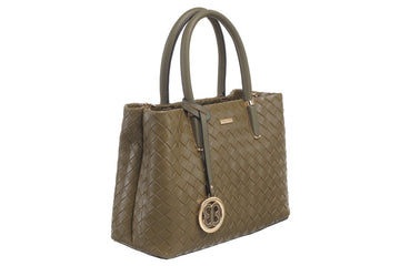 This sophisticated tote bag showcases a woven texture accented by a logo charm. It features a fully lined interior with multiple compartments for efficient organization. Designed with a detachable long strap and double handles, it offers versatile carrying options secured by a magnetic snap closure. Measuring 31cm in length, 23cm in height, and 12cm in width.