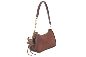 This elegant bag combines a baguette and shoulder style crafted from premium faux suede. It features a fully lined interior, a detachable strap, and secure zip closures including a back zip pocket for added convenience. Measuring 30cm in length, 18cm in height, and 9cm in width, it is finished with a charming detail and comes with a protective dust bag. The exterior is made from high-quality PU, while the interior is polyester, ensuring durability and style.