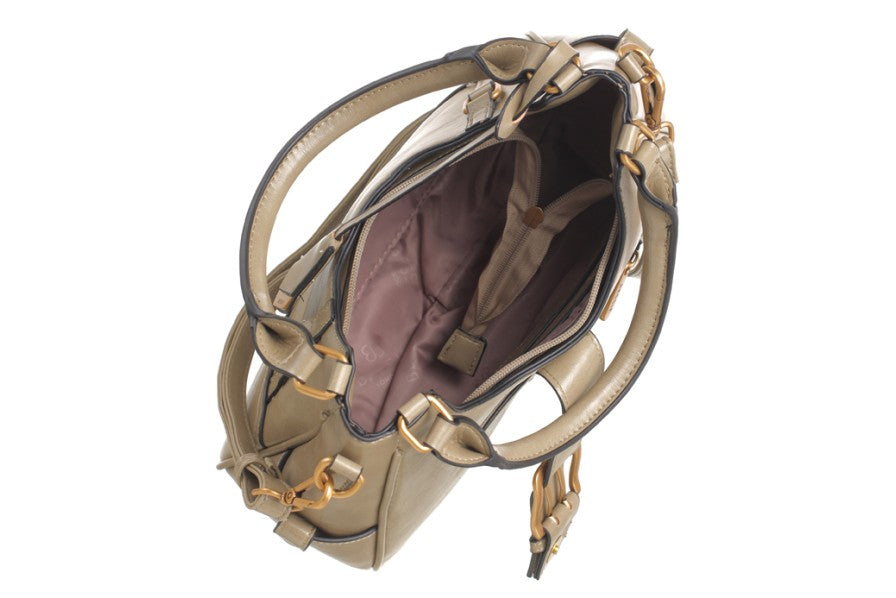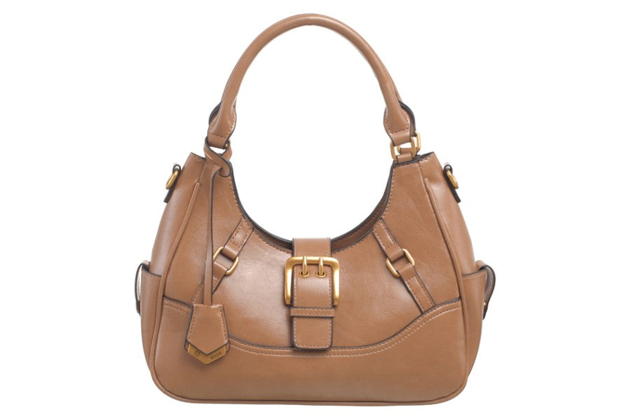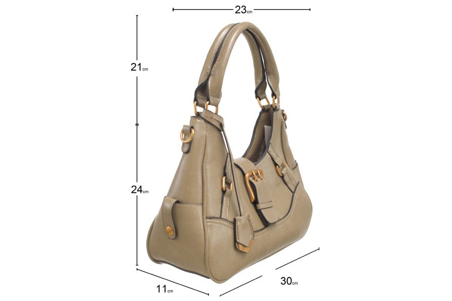 This sophisticated tote bag features a sleek buckle detail, double handles, and a detachable long strap for versatile carrying options. It boasts a fully lined interior with a secure zip closure. Measuring 30cm in length, 24cm in height, and 11cm in width, the bag is crafted from high-quality PU on the outside with a polyester lining. Included is a protective dust bag. Model height: 164cm.