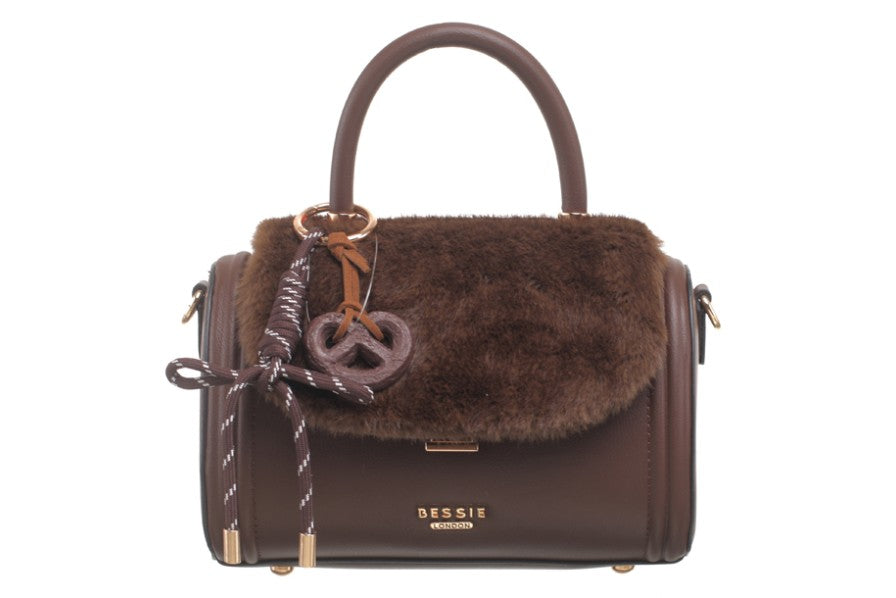 This elegant barrel-shaped crossbody bag features a plush faux fur exterior complemented by a charming accent. Fully lined inside for added refinement, it includes a detachable strap and a magnetic closure for seamless access. Measuring 22cm in length, 26cm in height, and 11cm in width, it is crafted from premium PU with a polyester interior. The bag is accompanied by a protective dust bag for storage.